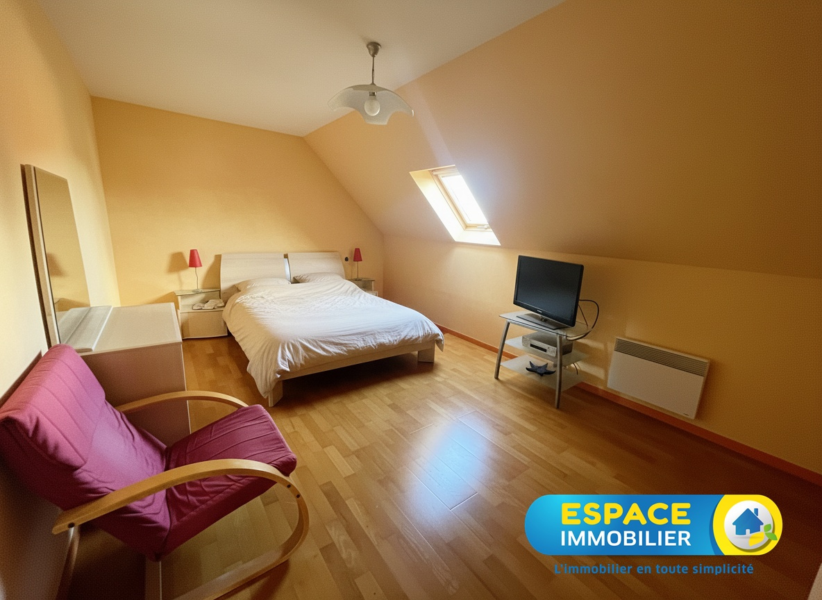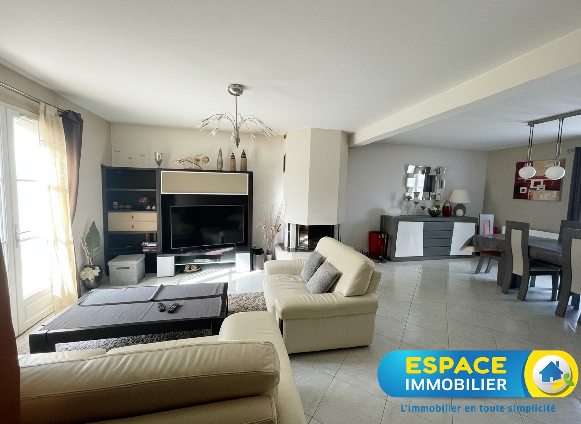 Maison familiale offrant de beaux volumes, composée au rez-de-chaussée d'une entrée cathédrale avec placard, d'un vaste séjour-salon agrémenté d'une cheminée avec insert, d'une cuisine aménagée et équipée, d'un local technique ainsi que d'une arrière-cuisine disposant d'une seconde cuisine aménagée. Vous y trouverez également un WC indépendant, une chambre parentale et une salle d'eau.Garage attenant avec porte motorisée. À l'étage, un palier dessert quatre chambres, une salle de bains et un WC indépendant. À l'extérieur, une grande terrasse de 60 m² prolonge agréablement l'espace de vie. Un abri de jardin en dur de 12 m² complète l'ensemble. Le terrain de 1000m², entièrement clos et paysagé, bénéficie à l'avant d'une allée en béton désactivé et d'un portail électrique.