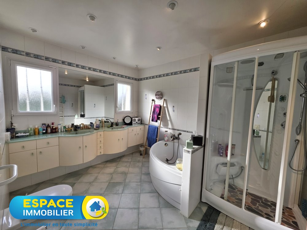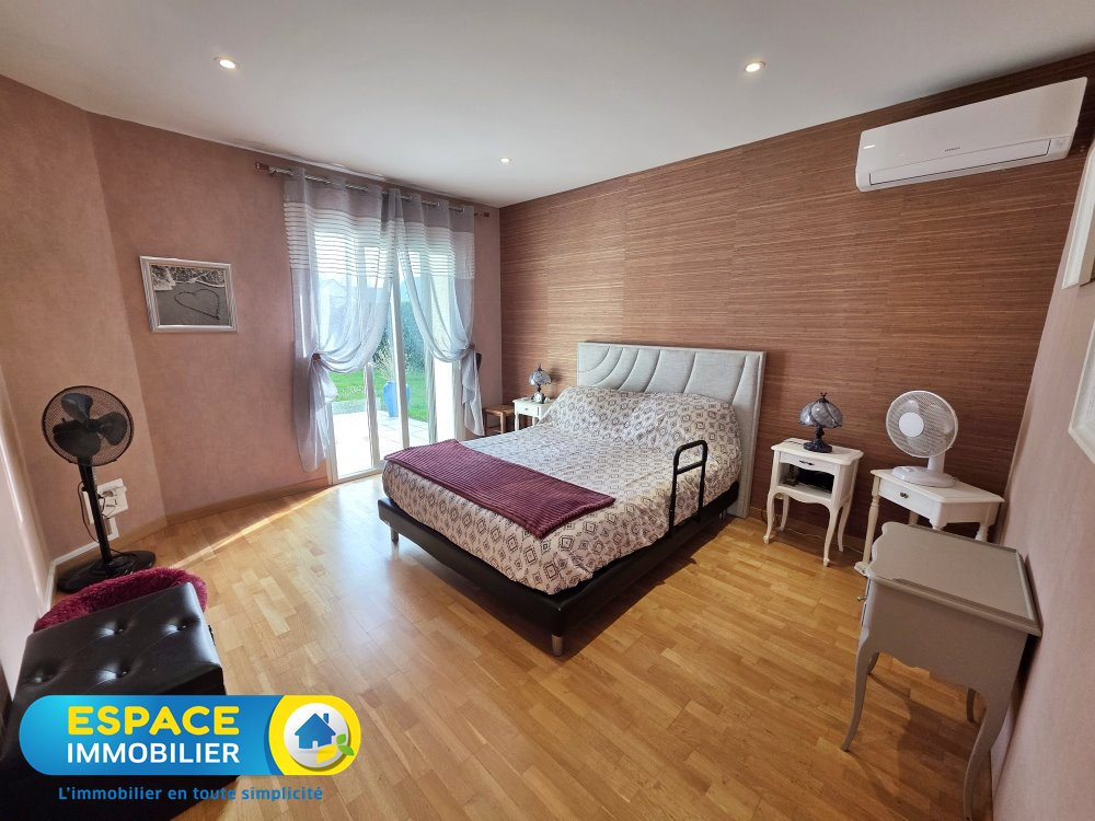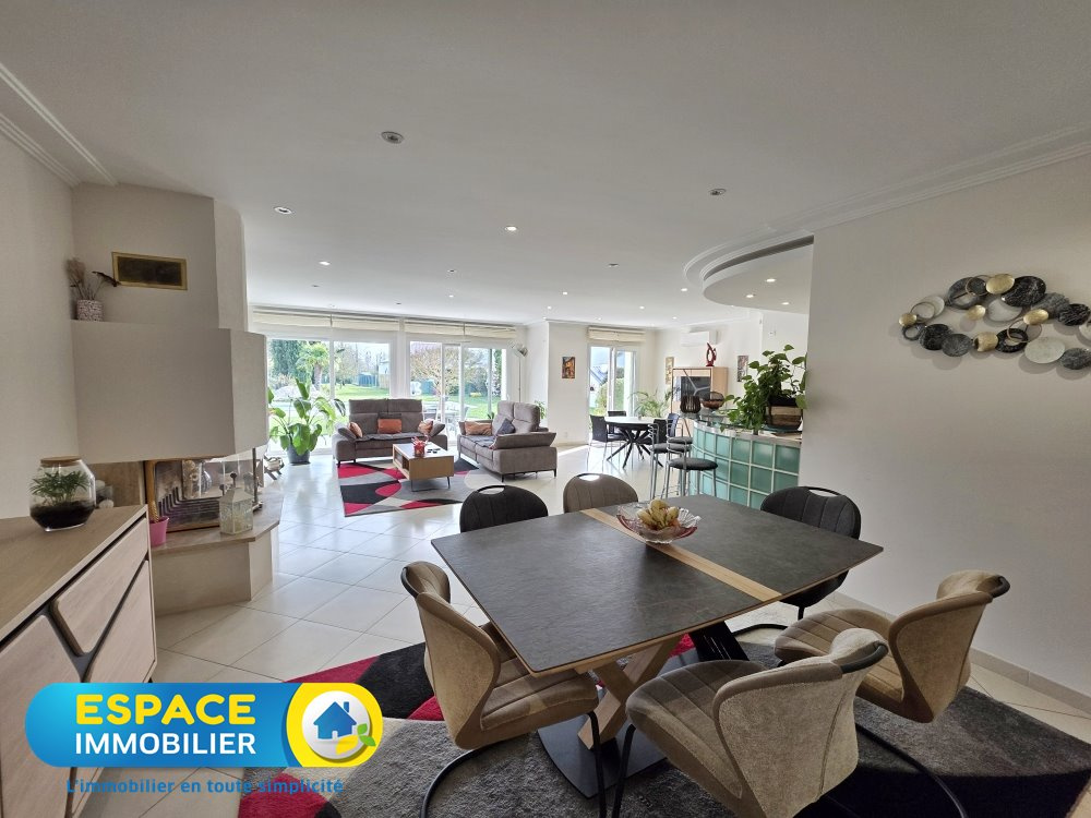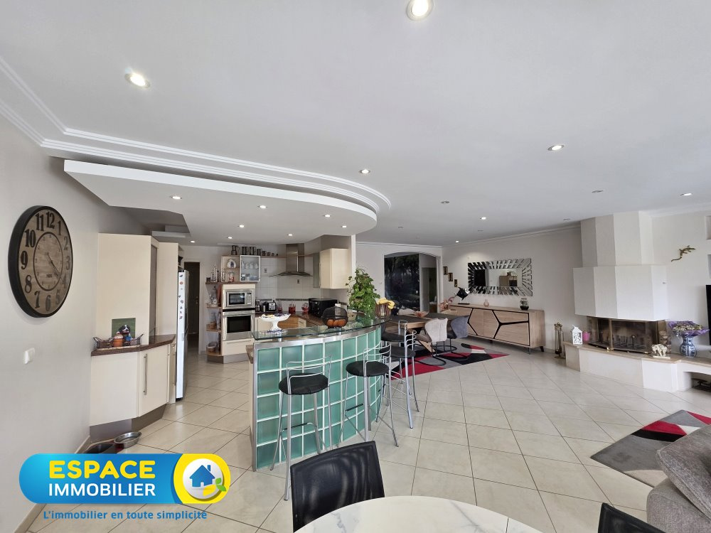 Grande maison à vivre de plain pied comprenant au rez-de-chaussée une entrée, un séjour-salon-cuisine équipée et aménagée de 70 m2 environ, un bureau, trois chambres,un grand dressing,wc, deux salles d'eau dont une avec baignoire et wc, une grande buanderie et un double garage avec prise recharge pour voiture électrique. Aspiration centralisée et climatisation du séjour et de la master. A l'étage une chambre d'amis. Au sous-sol une salle de billard, une cave et une chaufferie. Appentis pour voiture, trois chalets de jardin, four à pizzas et une piscine chauffée complètent l'ensemble.